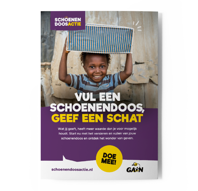 Hoe werkt het? Gebruik een schoenendoos die voldoet aan de afmetingen: de maximale hoogte is 12 cm en de maximale lengte is 34 cm. Als u de lengte en breedte bij elkaar optelt, mag dit minimaal 46 cm en maximaal 56 cm zijn. Voor wie maak je de doos (een meisje of een jongen) en schrijf dat op de bon op de achterzijde van de actiefolder, knip de bon uit en plak deze boven op je schoenendoos. Versier en vul de doos met spulletjes uit de checklist. Maak het persoonlijk: voeg een leuke kaart, foto of tekening van jezelf toe. Plak de doos niet dicht maar gebruik een postelastiek. Geef € 5,- voor de transport- en organisatiekosten. Stop dit in de envelop uit de actiefolder en doe de ingevulde envelop onder het postelastiek. Ook kunt u deze € 5,- overmaken naar de organisatie. Alle informatie hierover vindt u in de folder. De dozen moeten in ieder geval gevuld zijn met 4 schriften, 3 pennen, gum, puntenslijper, kleurpotloden, 3 potloden, tandenborstel en een stuk zeep. Het is belangrijk dat deze artikelen in de doos zitten anders kunnen kan deze niet ingeleverd worden.